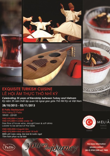 28Ekim - 2 Kasım 2013 tarihleri arasında,Büyükelçiliğimiz tarafından, Melia Hanoi Oteli'nde bir "Türk Yemekleri Festivali" düzenlenecektir.