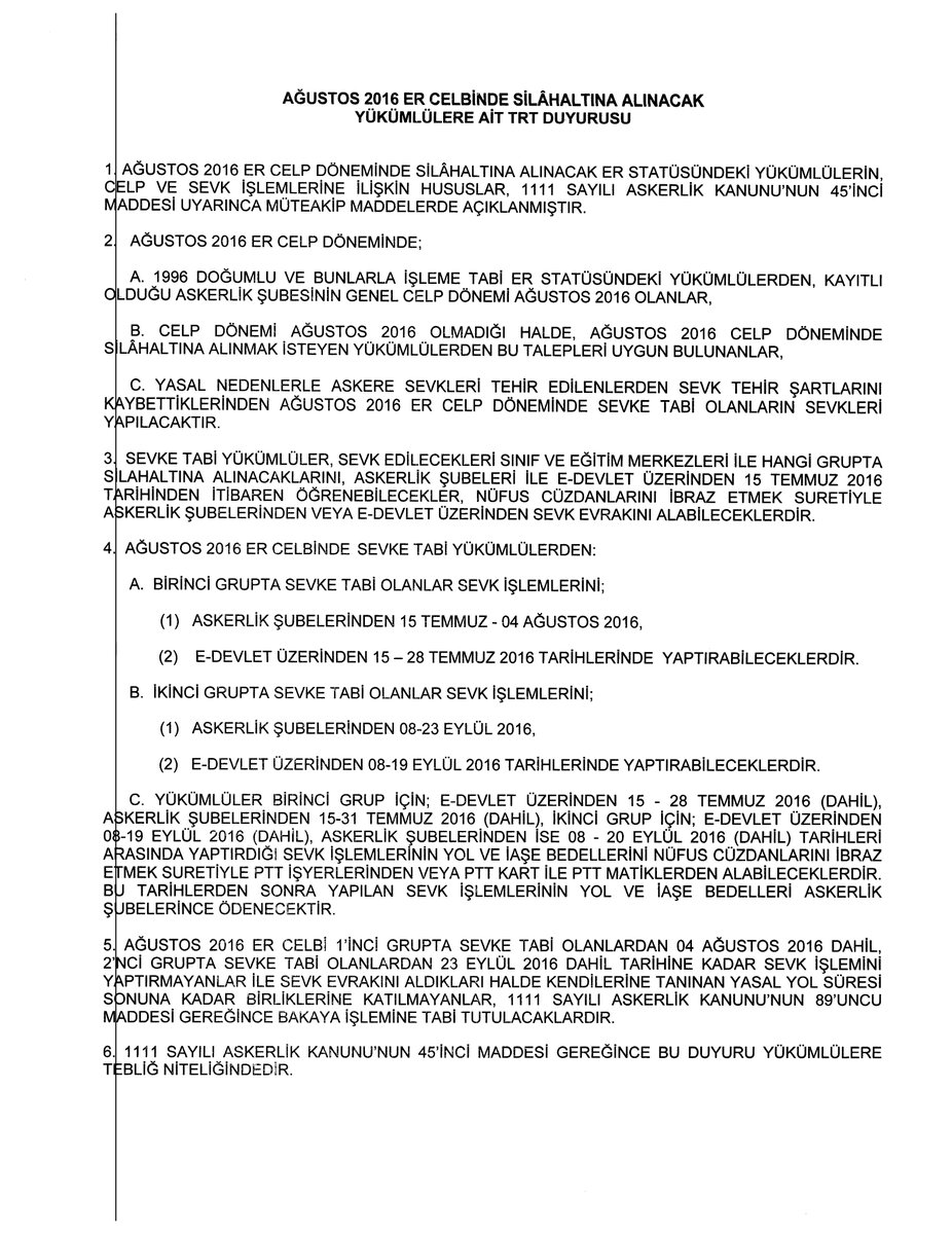 Ağustos 2016 Celp Döneminde Silahaltına Alınacak Er Statüsündeki Yükümlülerin Celp ve Sevk Faaliyetlerine Ait Duyuru
