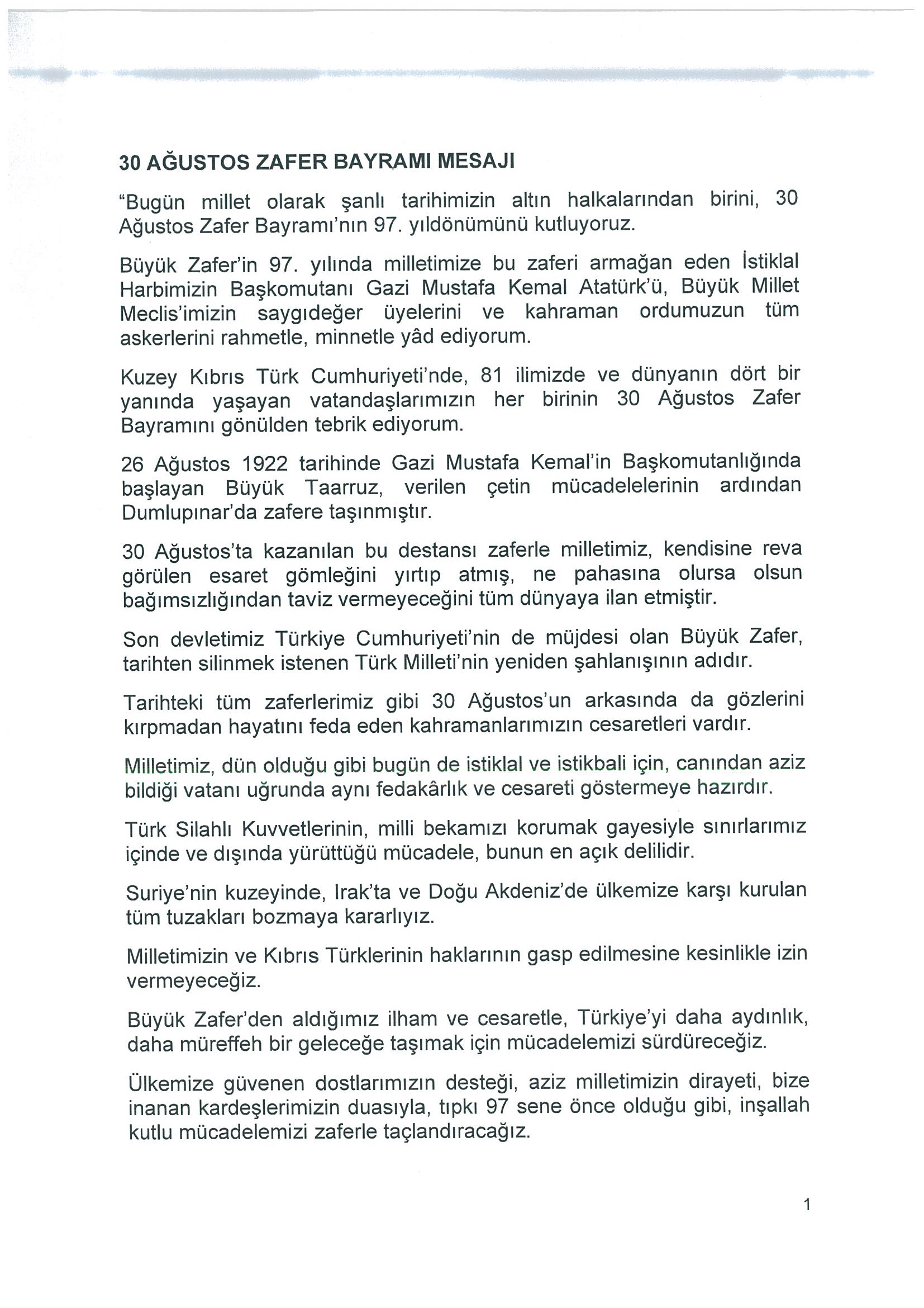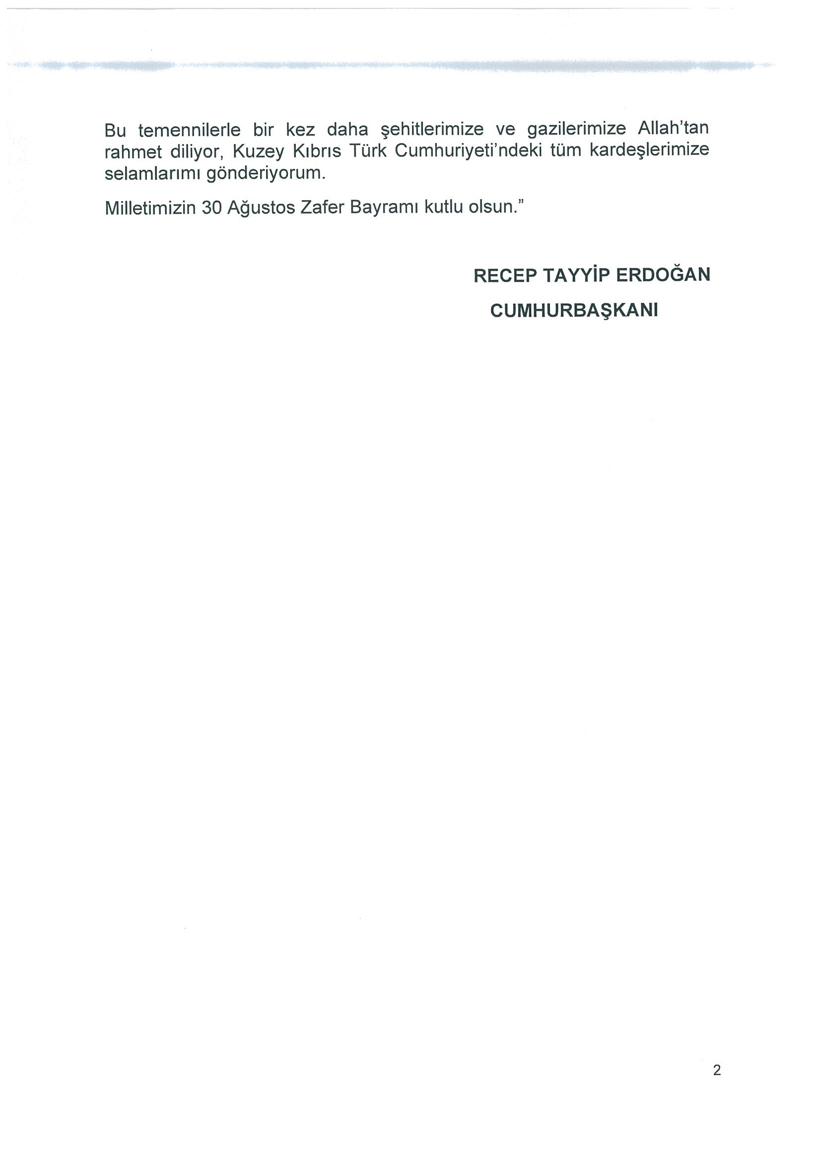 Sayın Cumhurbaşkanımızın 30 Ağustos Zafer Bayramı mesajı