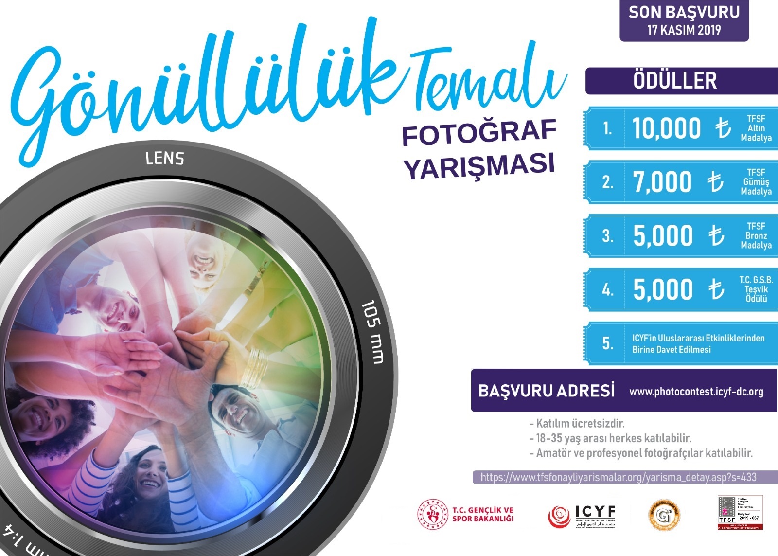Gençlik ve Spor Bakanlığımız ile İslam İşbirliği Teşkilatı'nın gençlik alanındaki bağlı kuruluşu olan İslam İşbirliği Gençlik Forumu gönüllülük temalı uluslararası fotoğraf yarışması düzenlemektedir. Detaylı bilgiler için:https://www.tfsfonayliyarismalar.org/yarisma_detay.asp?s=433 ve https://photocontest.icyf-dc.org/tr/anasayfa/