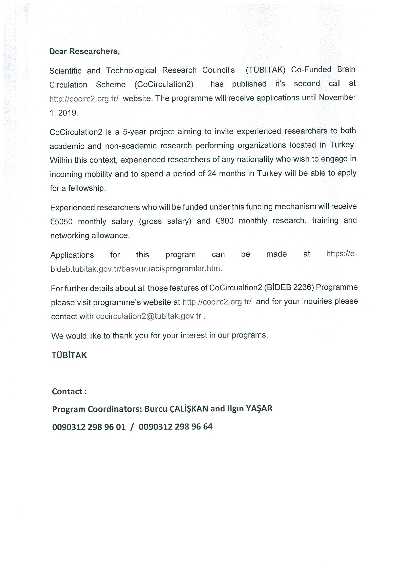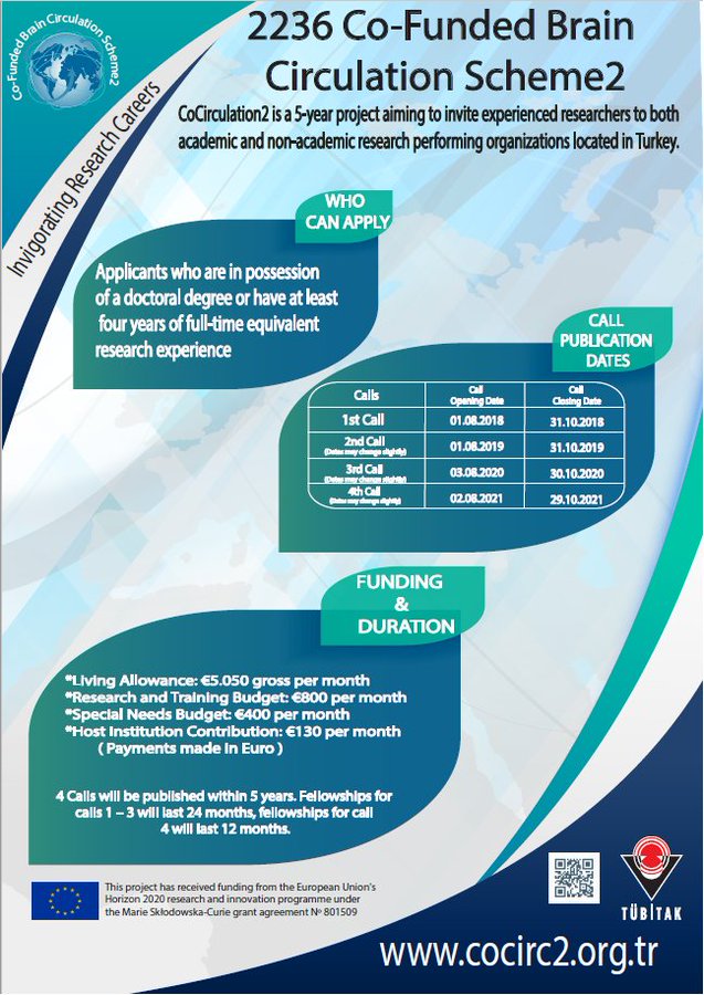 Scientific and Technological Research Council's (TÜBİTAK) Co-Funded Brain Circulation Scheme (CoCirculation2) has published its second call at http://cocirc2.org.tr website.