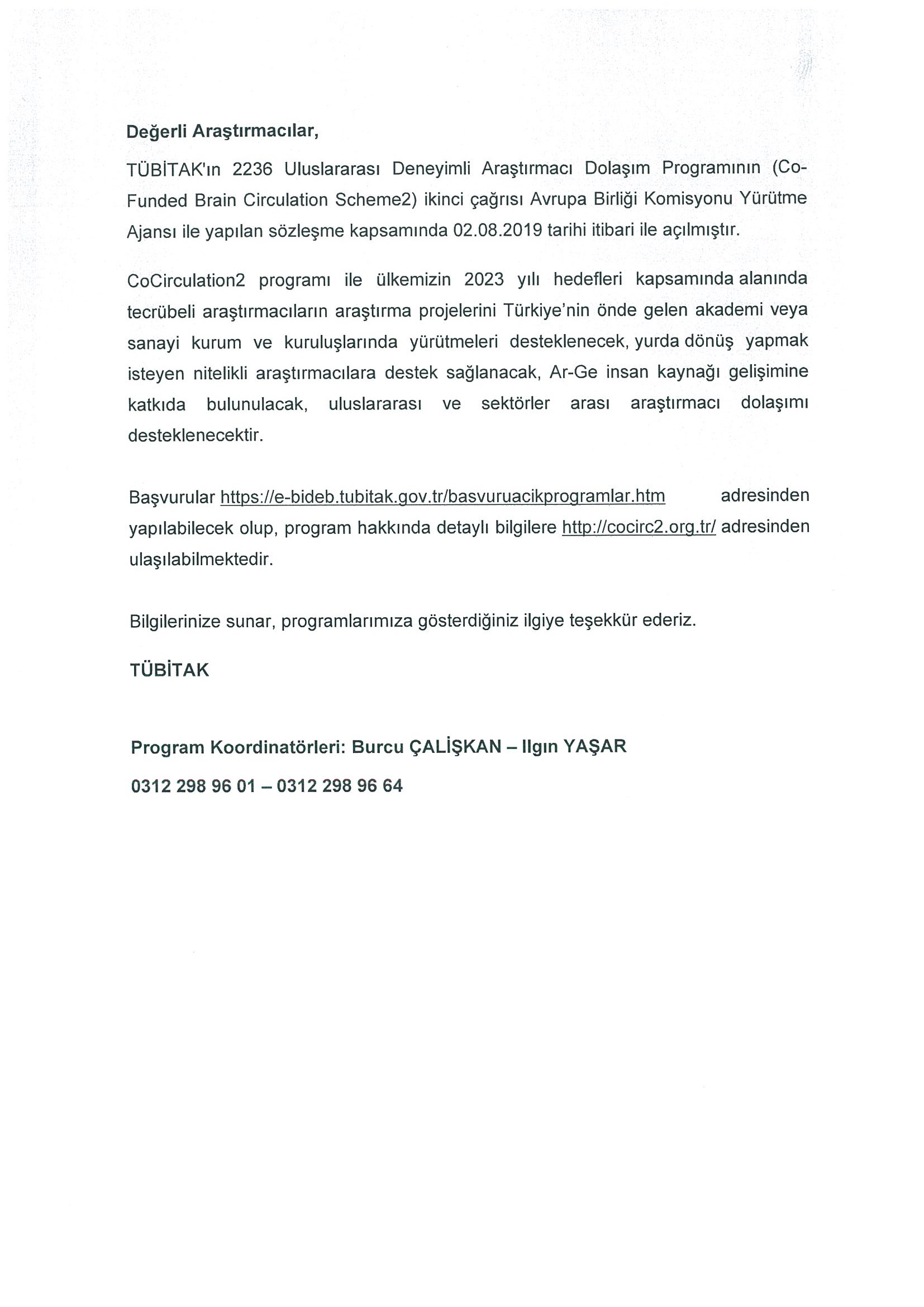 TÜBİTAK ve Avrupa Komisyonu ortaklığında yürütülen “2236 Uluslararası Deneyimli Araştırmacı Dolaşım Programı” nın ikinci çağrısı açılmıştır.