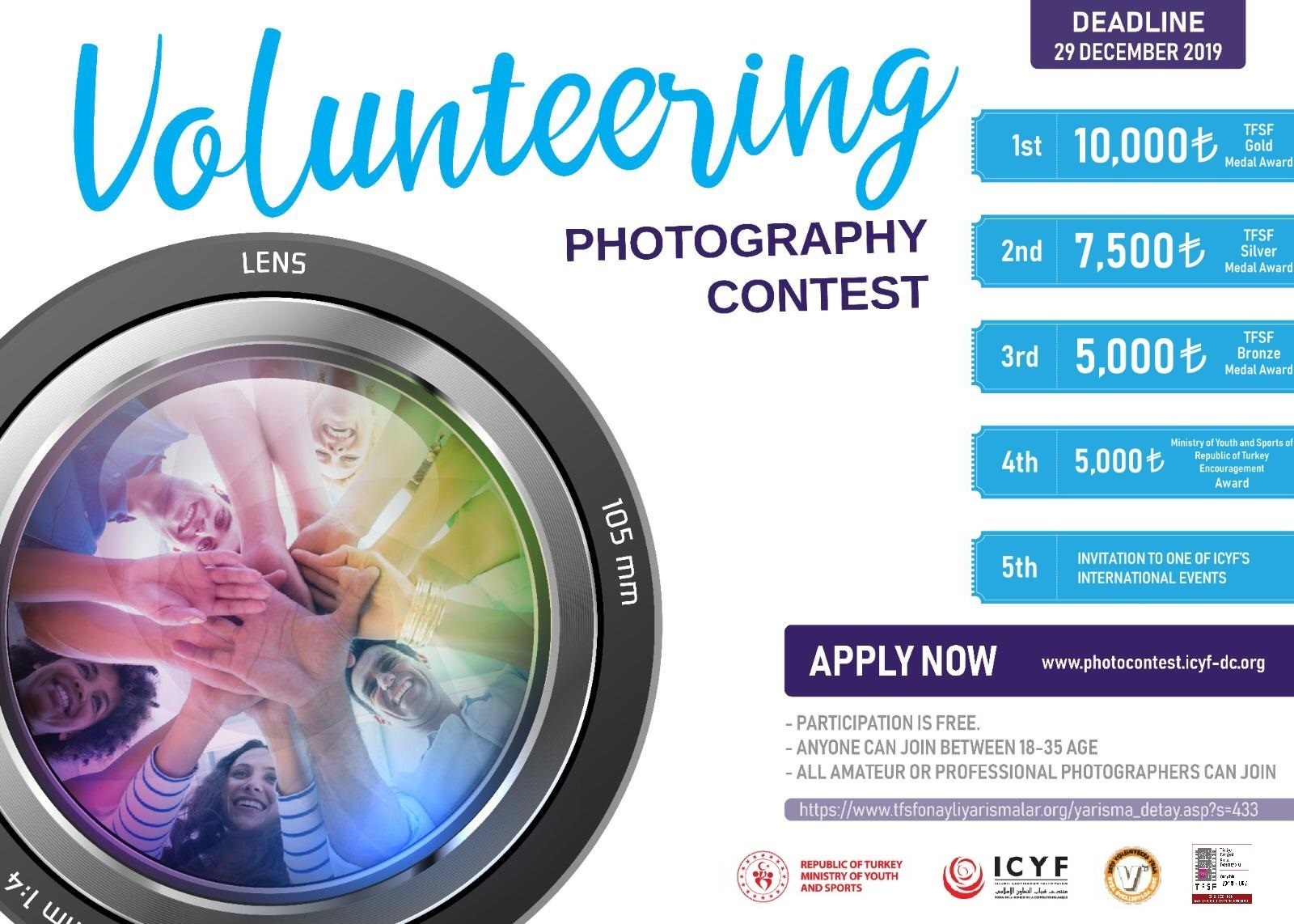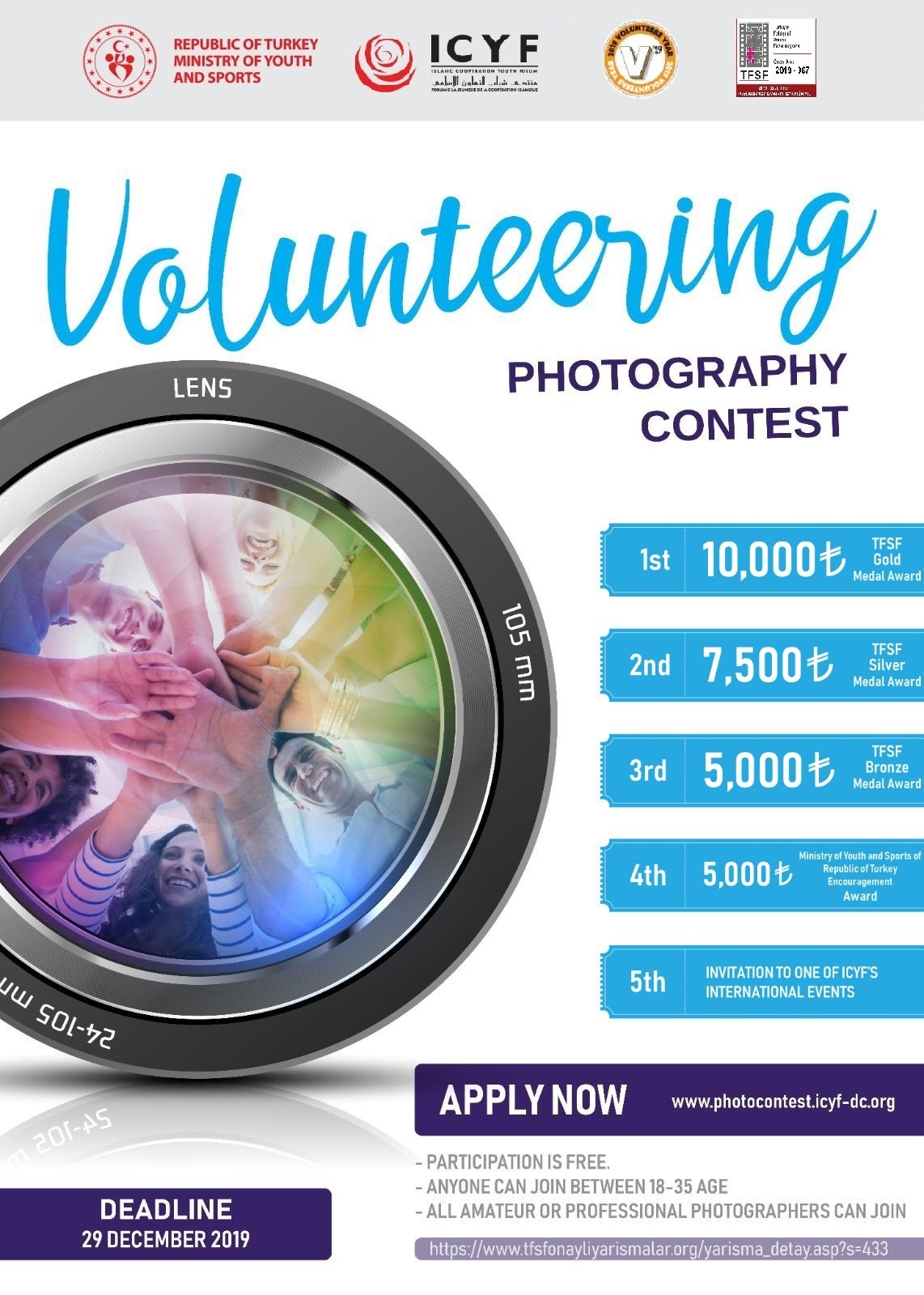 Gençlik ve Spor Bakanlığımız ile İslam İşbirliği Teşkilatı'nın gençlik alanındaki bağlı kuruluşu olan İslam İşbirliği Gençlik Forumu gönüllülük temalı fotoğraf yarışması düzenlemektedir. Son başvuru 29 Aralık 2019 tarihine uzatılmıştır. Detaylı bilgi için: https://www.tfsfonayliyarismalar.org/yarisma_detay.asp?s=433