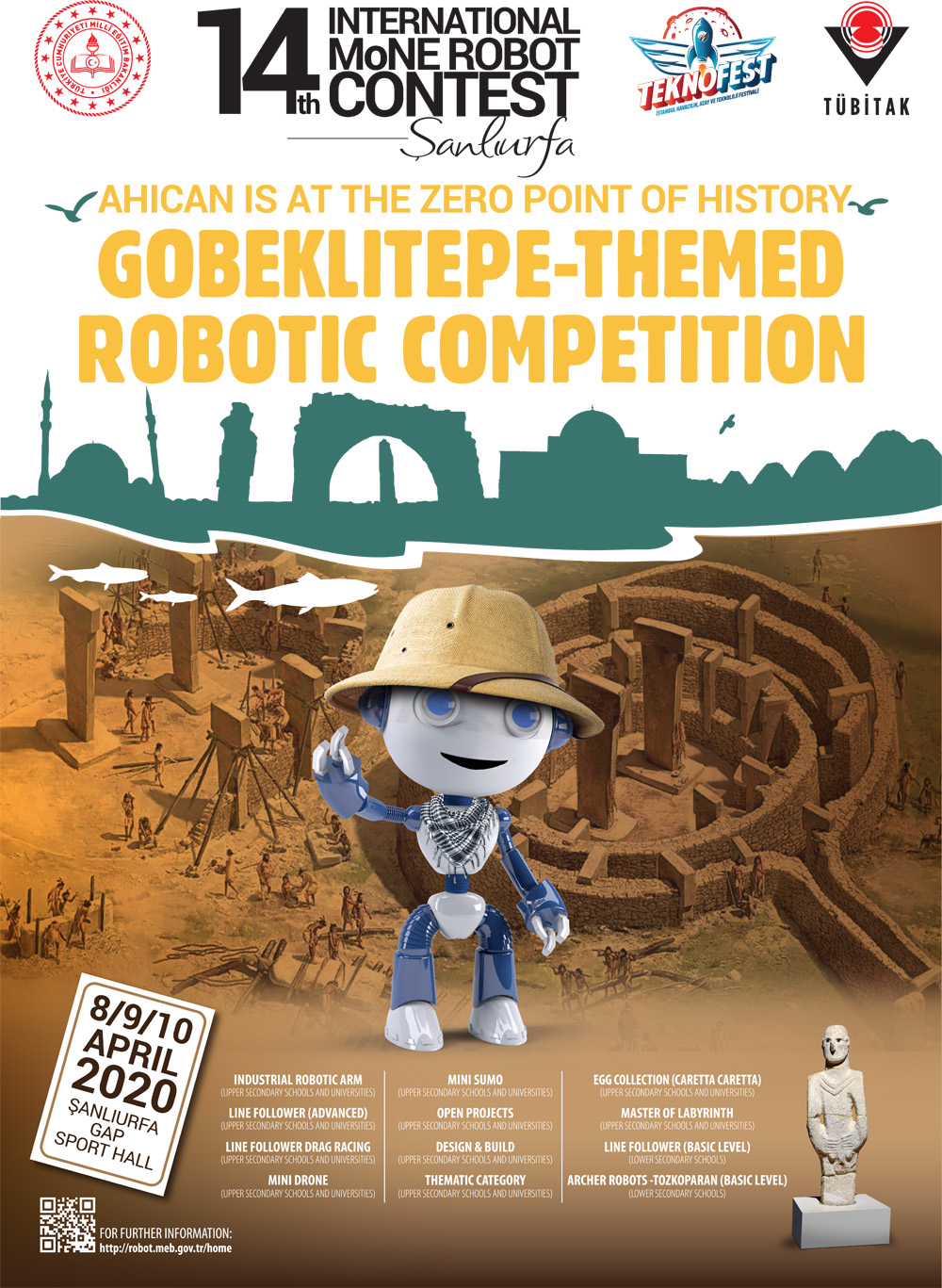 Gobeklitepe-themed 14th International MoNE Robotic Contest will be held on 8-10 April 2020 in Şanlıurfa, Turkey. The contest is open to all high school and university students.