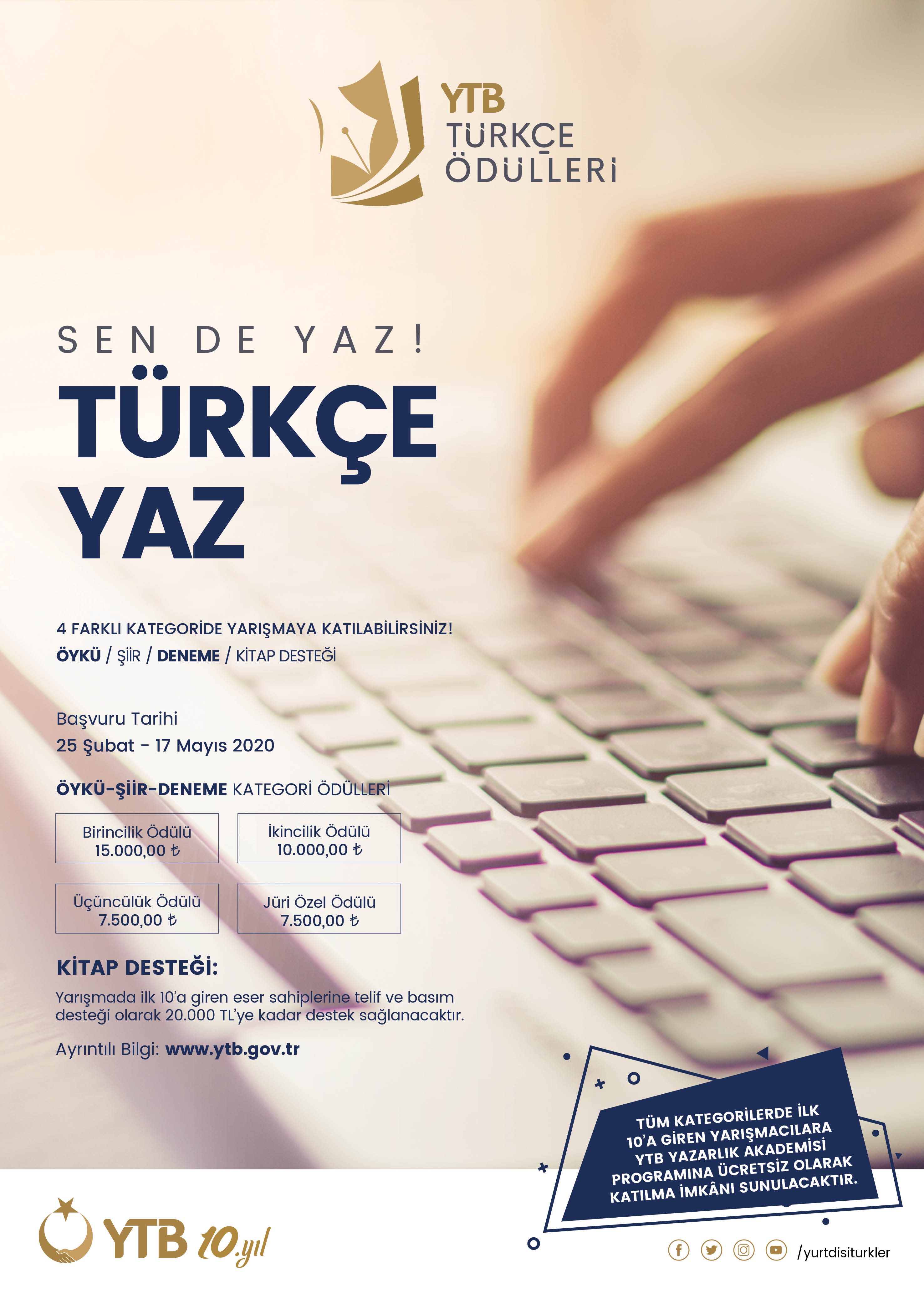 Yurtdışında yaşayan vatandaşlarımız için öykü, şiir, deneme ve kitap desteği olmak üzere 4 ayrı kategoride düzenlenen “2020 YTB Türkçe Ödülleri Yarışması”na başvurular başlamıştır.